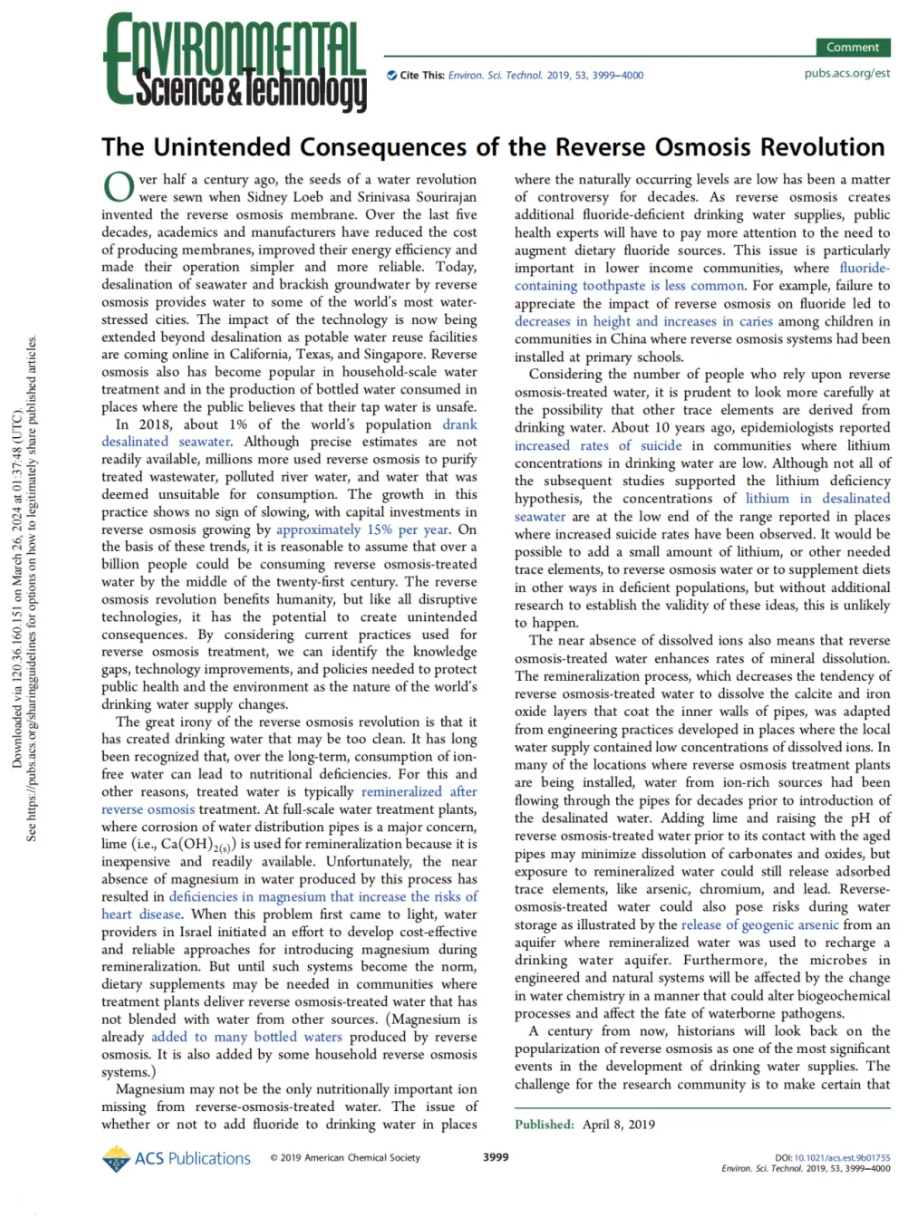記:您認(rèn)為中國有關(guān)部門是否意識到反滲透膜凈水的意外后果?